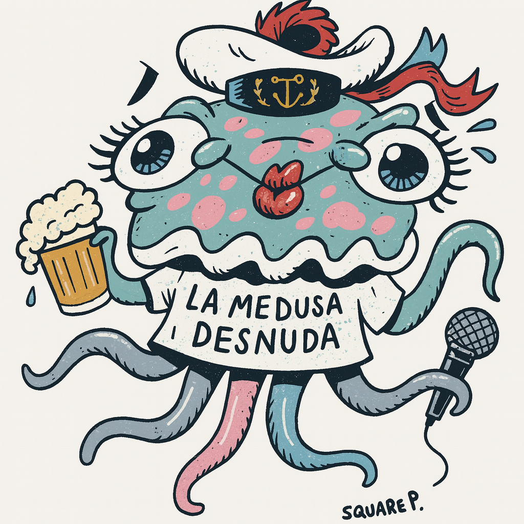 Legend has it that beneath the waves of Port Ginesta lived a curious jellyfish. Unlike the others, she wasn’t content to drift quietly—she wanted to dance, to glow, to tempt sailors and land-folk alike into joining her for a drink by the sea. She shed her shell, rose to the surface, and became La Medusa Desnuda—the naked jellyfish.